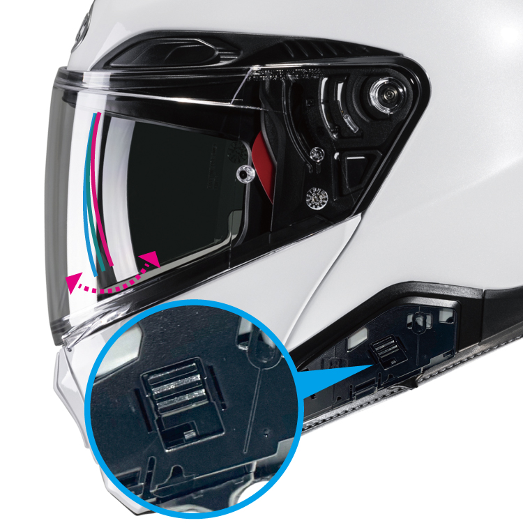 あご部分にある赤いレバーを操作することでチンバーの開閉が可能。 シーンに合わせてオープンフェイスの利便性とフルフェイスの静粛性を切り替えてご使用いただけます。 停車時、不意にチンバーが閉じないように、左こめかみ部分のロック機構でオープン状態を保持できます。