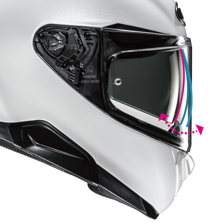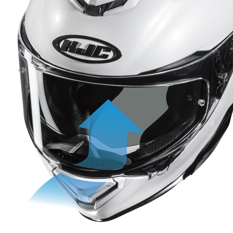 口元にあるロアインテークから取り入れた走行風をシールド内側に流すことで、シールドの曇りをやわらげます。