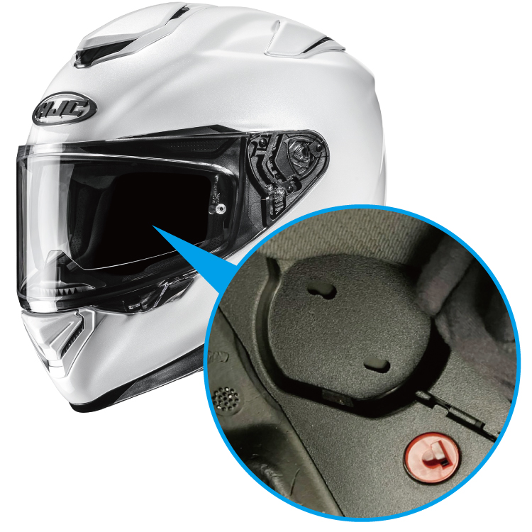 HJCヘルメット専用設計のSENA製インカム“SMART HJC 21B & 50B”のビルトイン機構を装備。 インカム本体のアタッチメントはもちろん、配線のガイドやスピーカーホールも備え、取り付けも簡単に。見た目もスマートかつ、接続中に聞こえる風切り音やインカム脱落を軽減します。