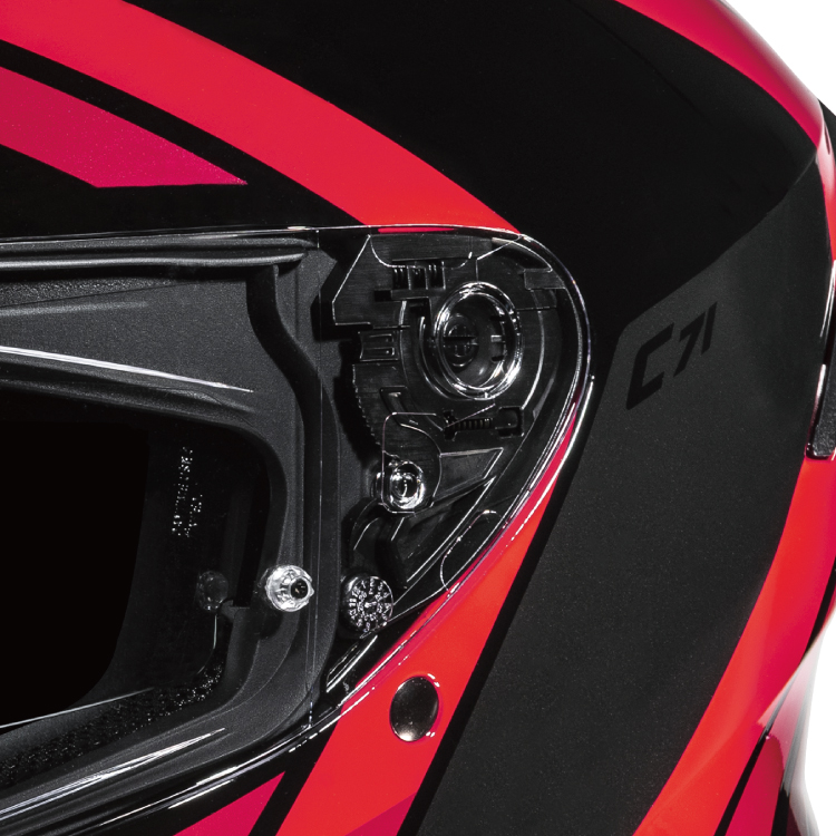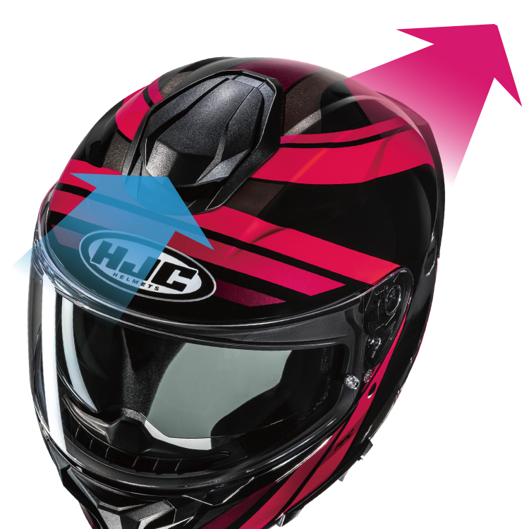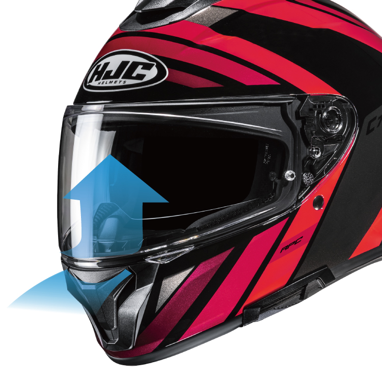 口元にあるロアインテークから取り入れた走行風をシールド内側に流すことで、シールドの曇りをやわらげます。