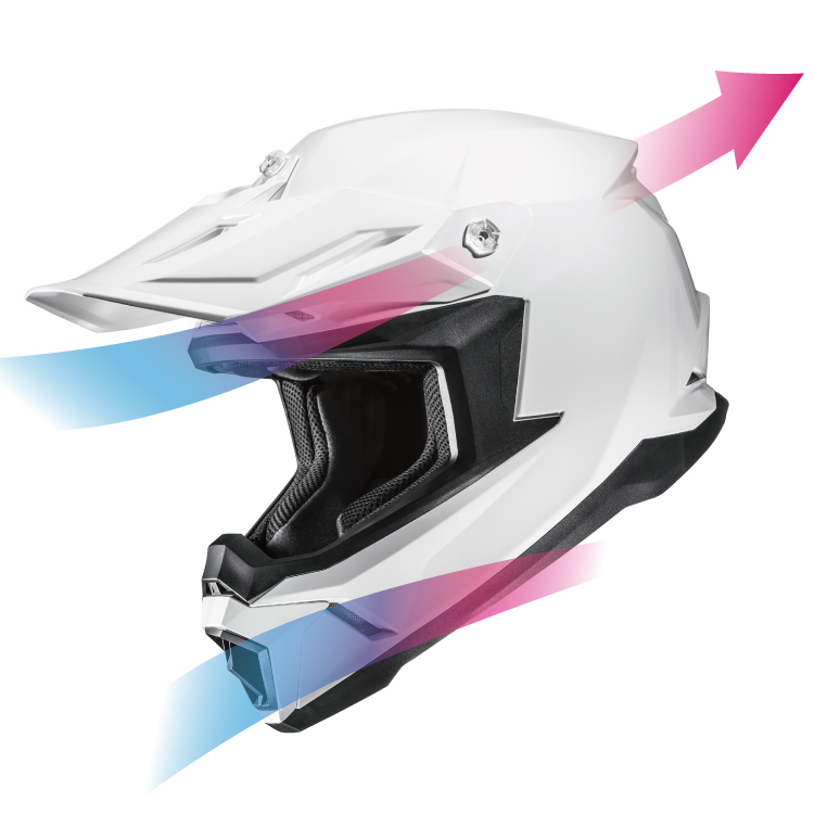 前頭部のエアインテークから取り入れた走行風を後頭部のアウトレットへ流し、効率よくヘルメット内部の熱気を排出します。