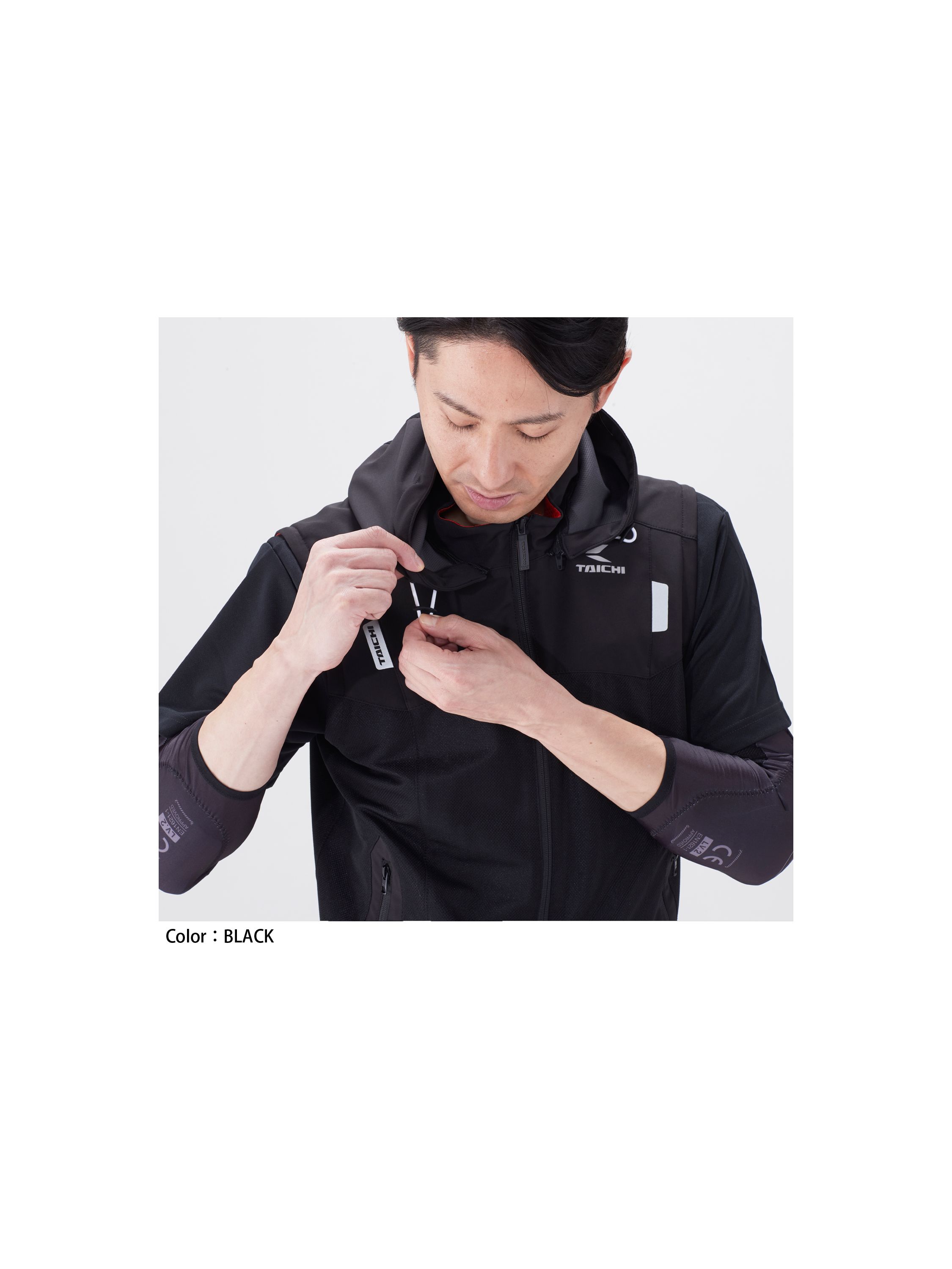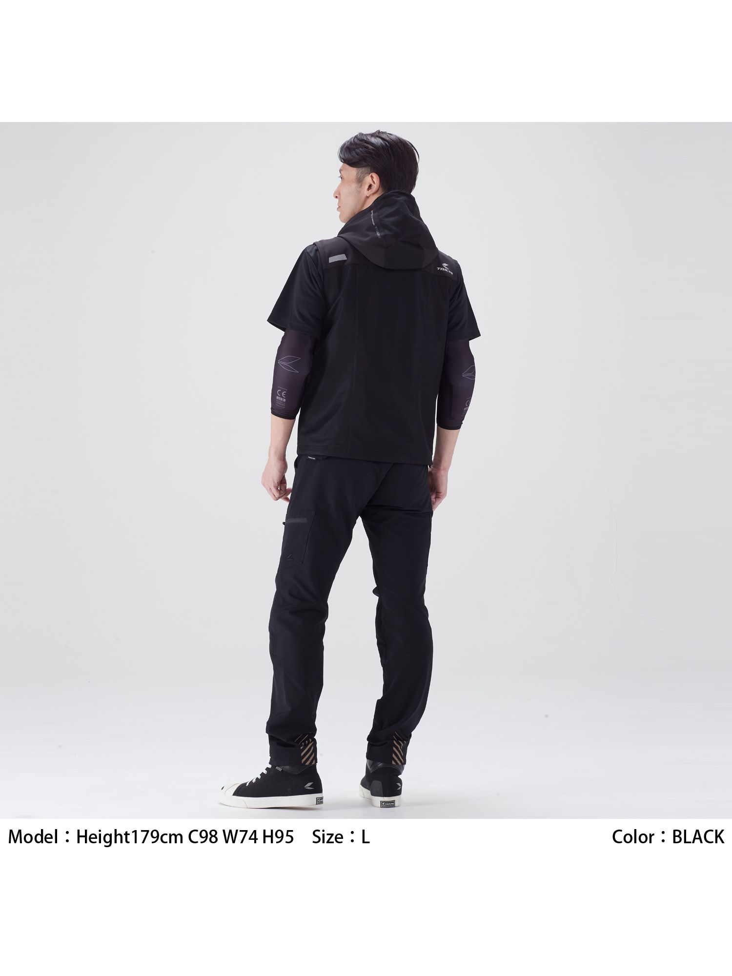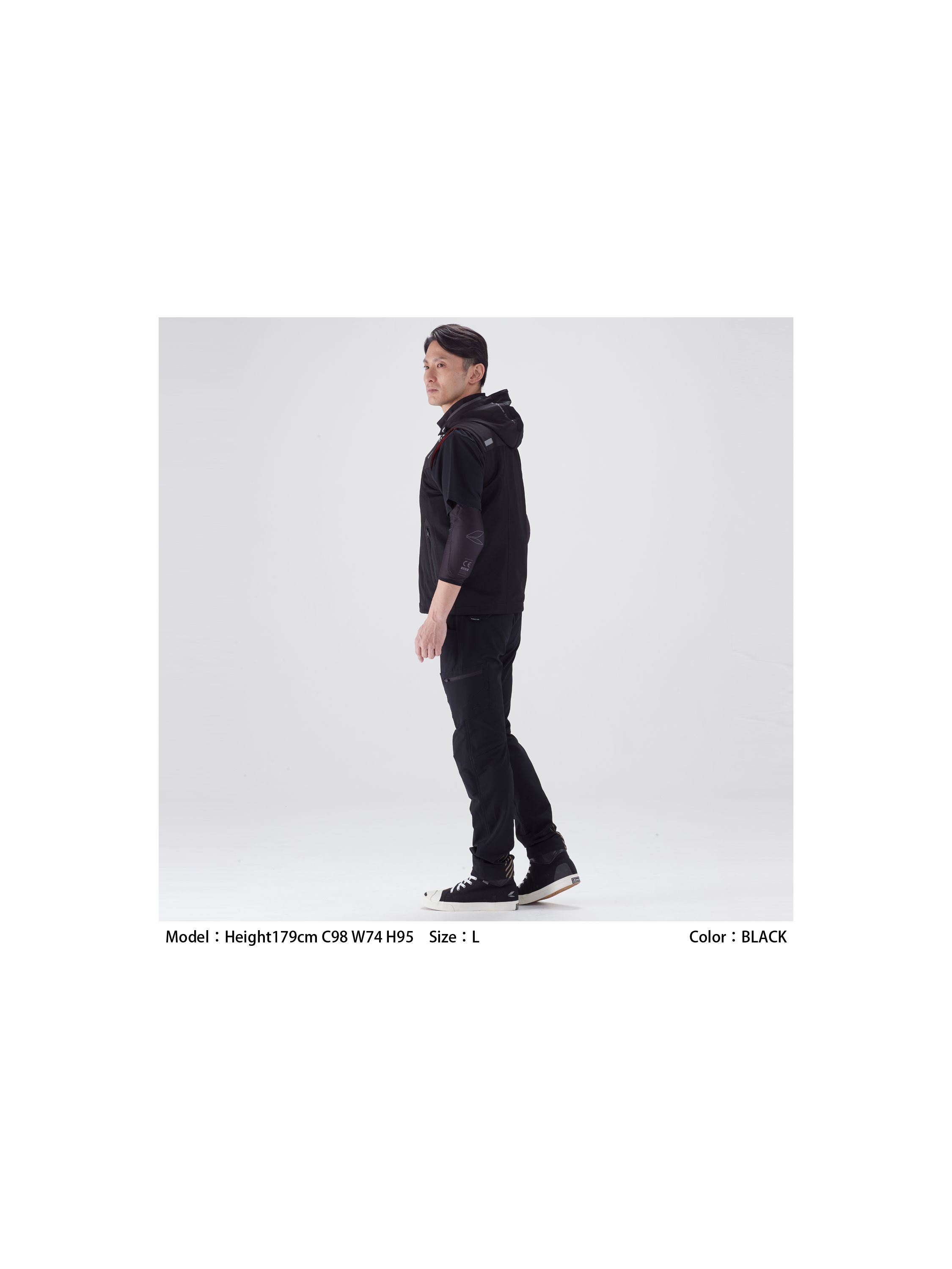着用スタイルにあわせて、フード部分はファスナーで取り外しが可能。また、通気性も高く普段着のようなデザインのため、休憩時にはアウターを脱いでベスト単体で快適に過ごせます。