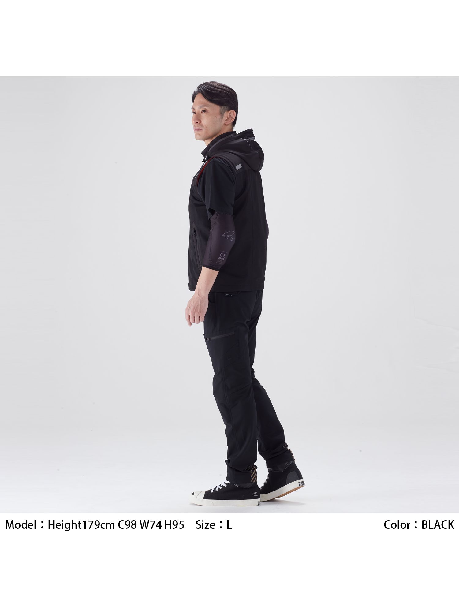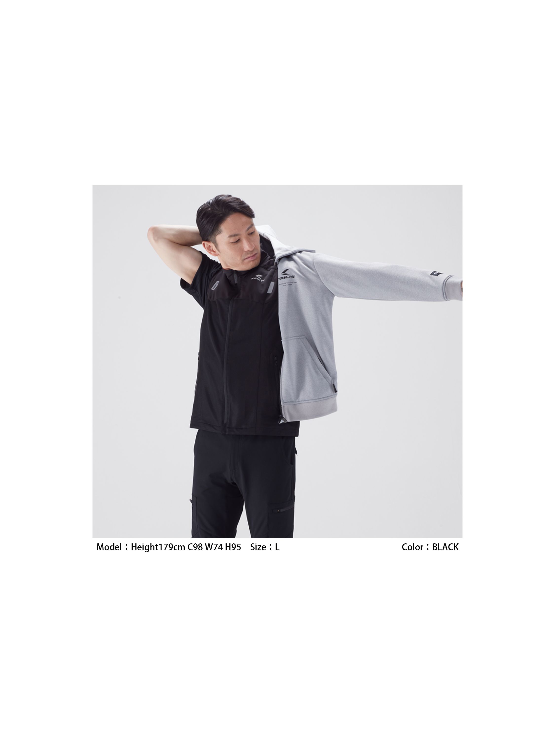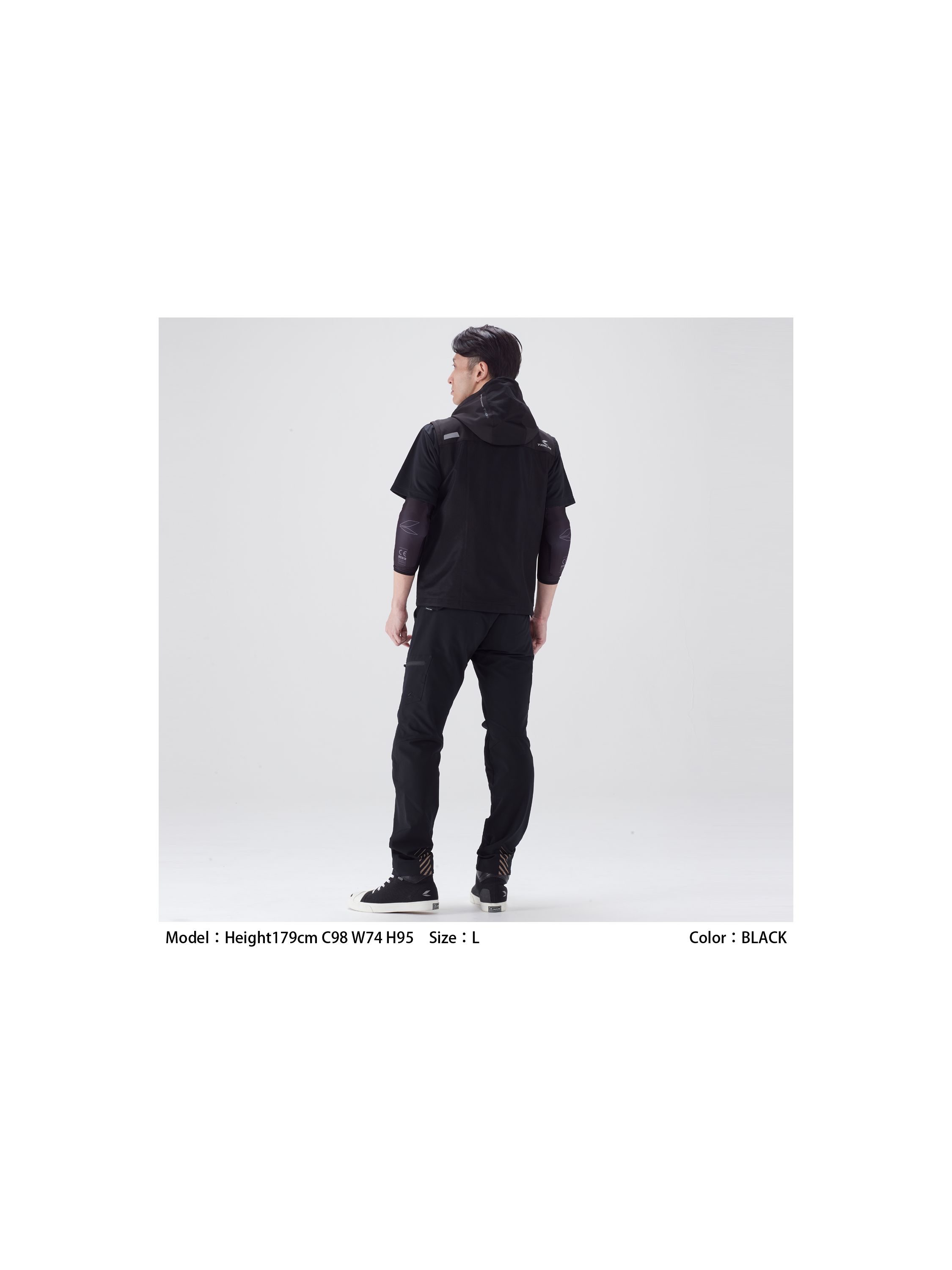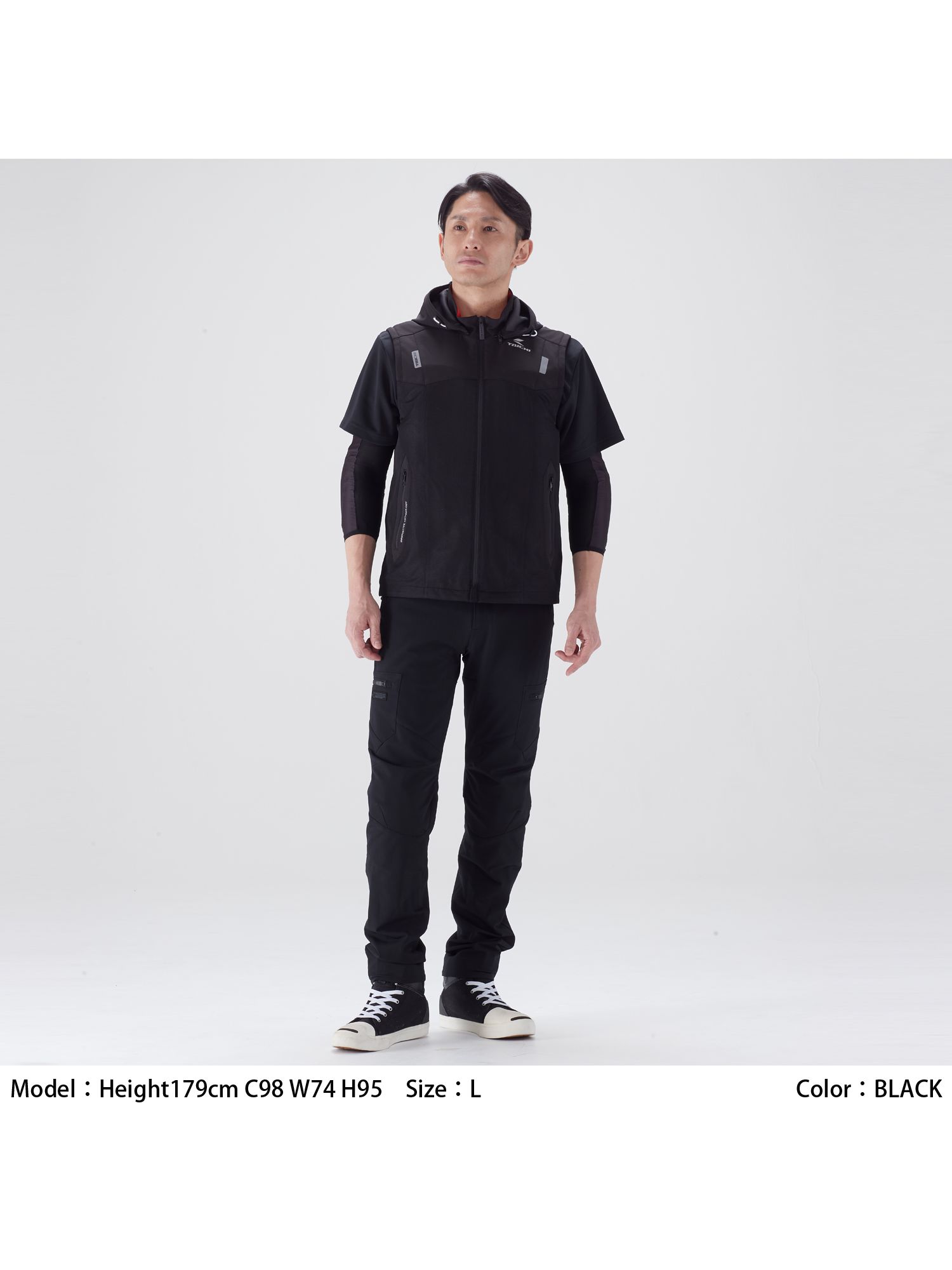 着用スタイルにあわせて、フード部分はファスナーで取り外しが可能。また、通気性も高く普段着のようなデザインのため、休憩時にはアウターを脱いでベスト単体で快適に過ごせます。