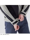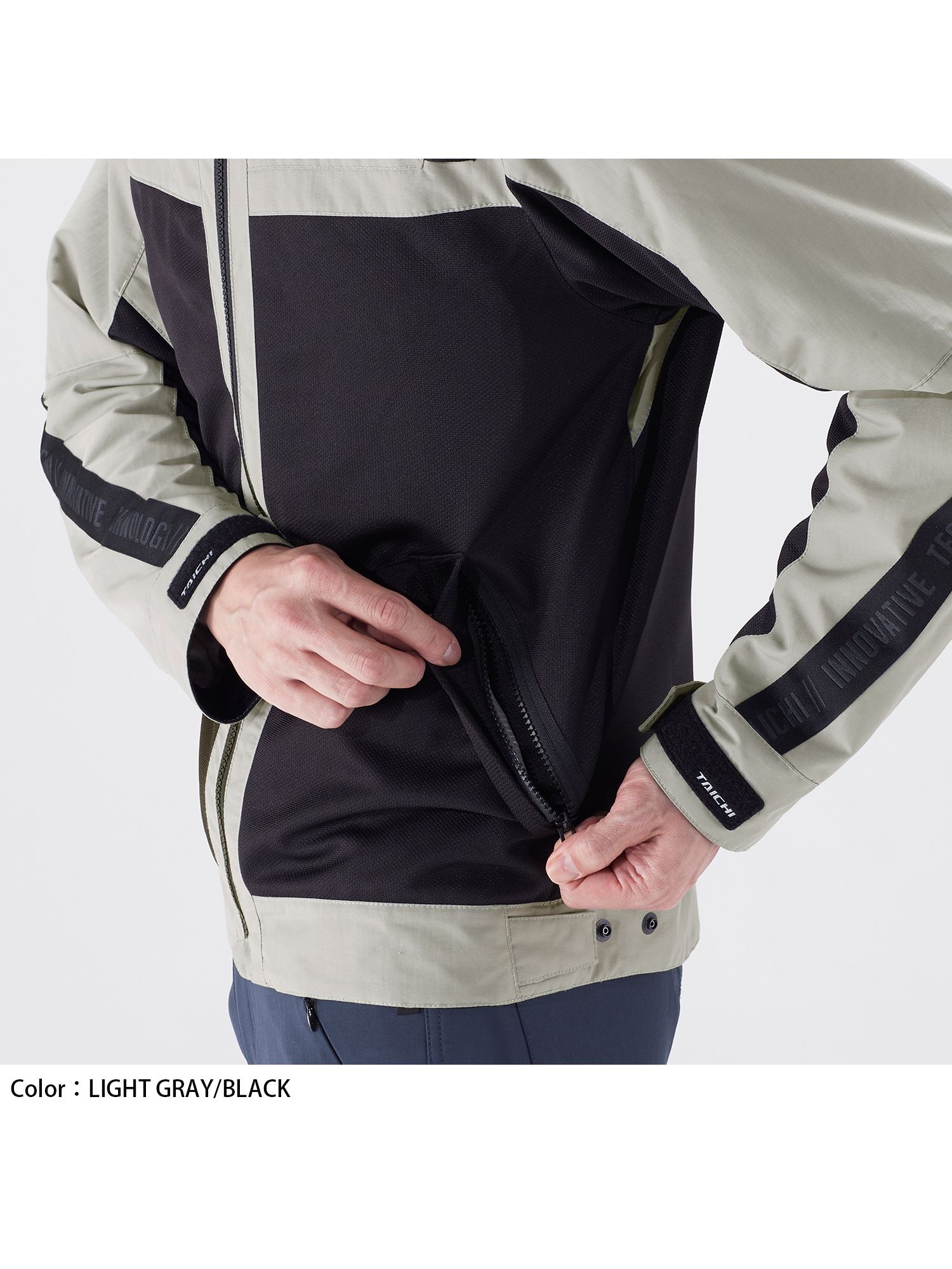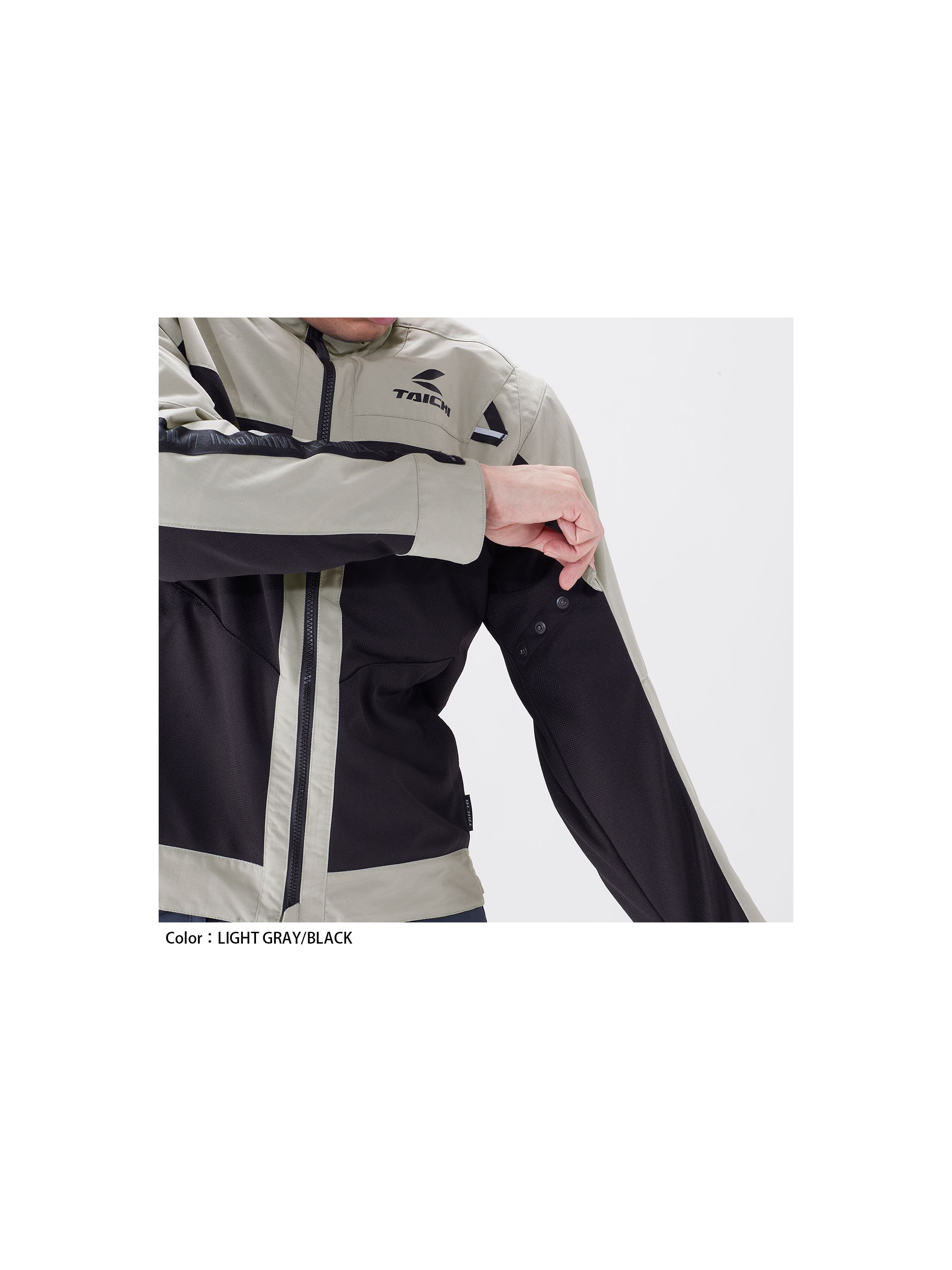 広範囲に配置されたメッシュ素材と布地を組み合わせ、強度を持ちながらも通気性に優れた春夏向けエアスルージャケット。