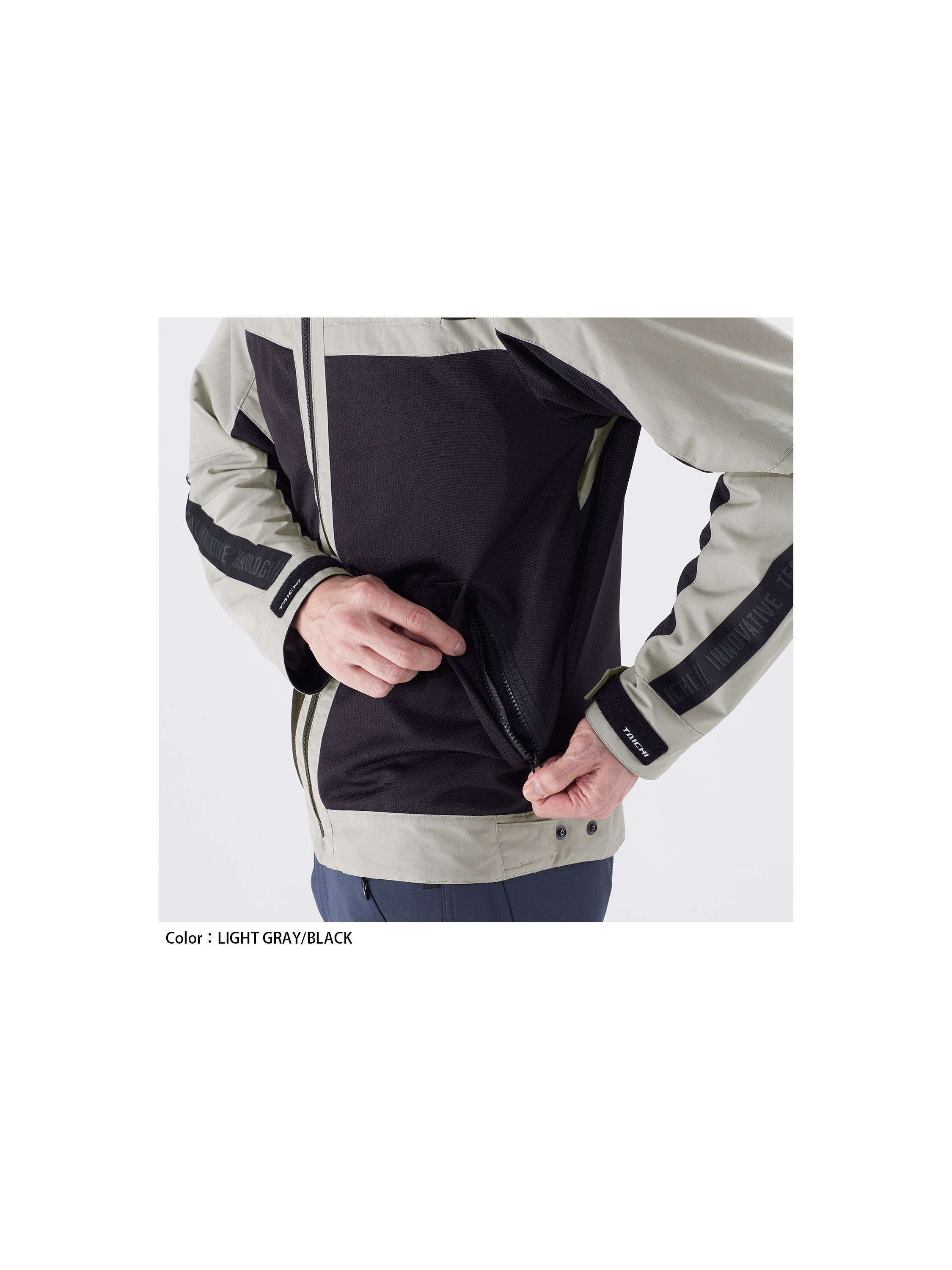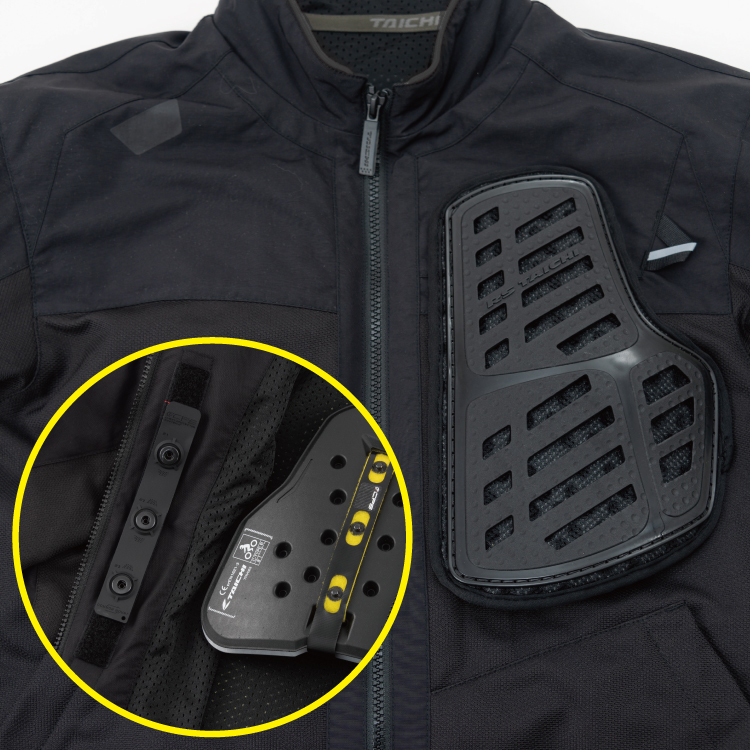 内装の腰付近(背中用プロテクターの開口部より下方)にある開口部より手を入れ、脇付近を通過して胸に到達すると、ベルクロで固定されたプロテクターの着脱が可能となります。