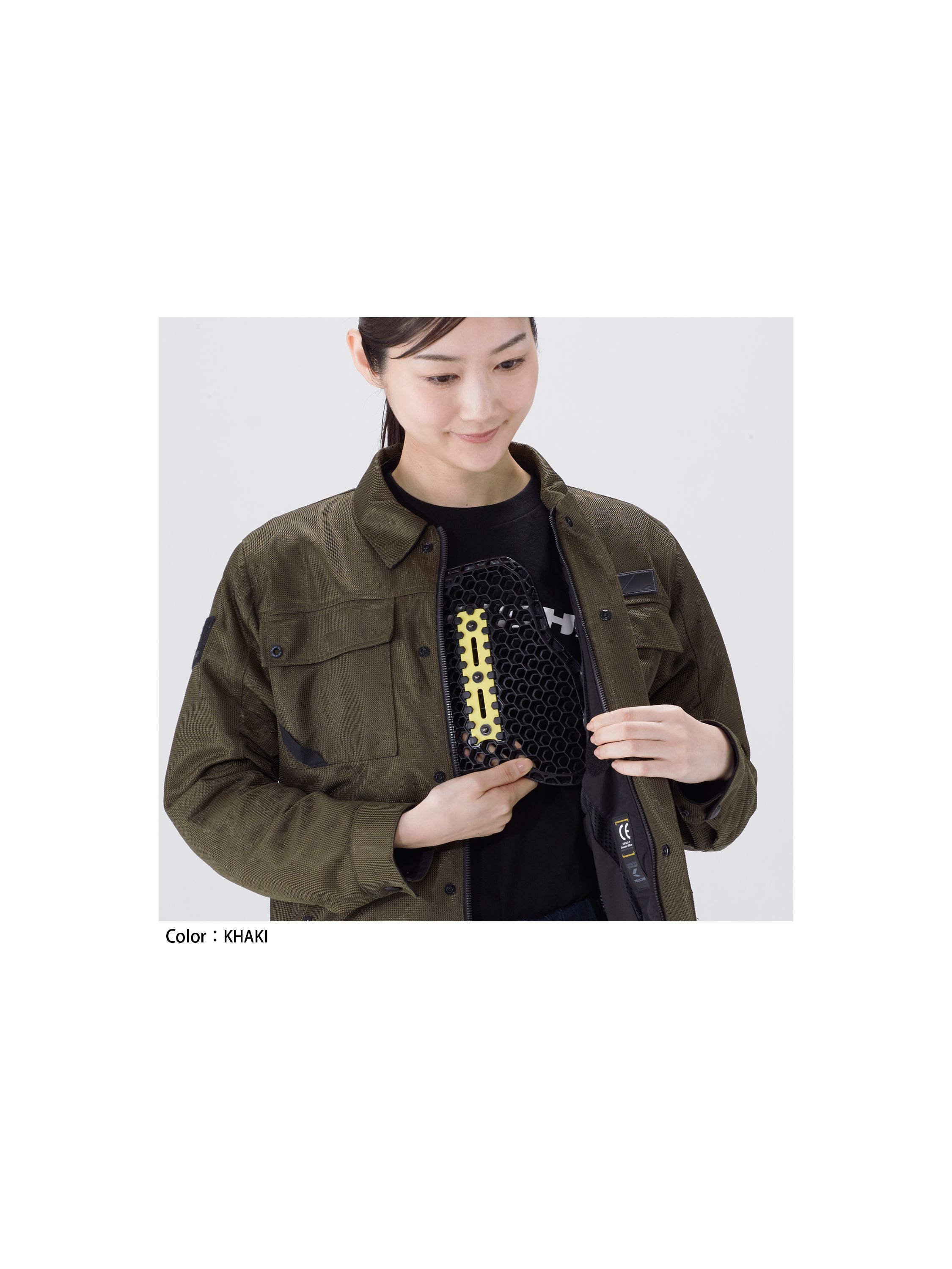 肩・肘には、衝撃吸収性能と柔軟性に優れたCE Lv.1プロテクター(ソフトタイプ)、背中にはフォームパッドを内蔵。別売りのプロテクターと入れ替えてアップグレードも可能。
