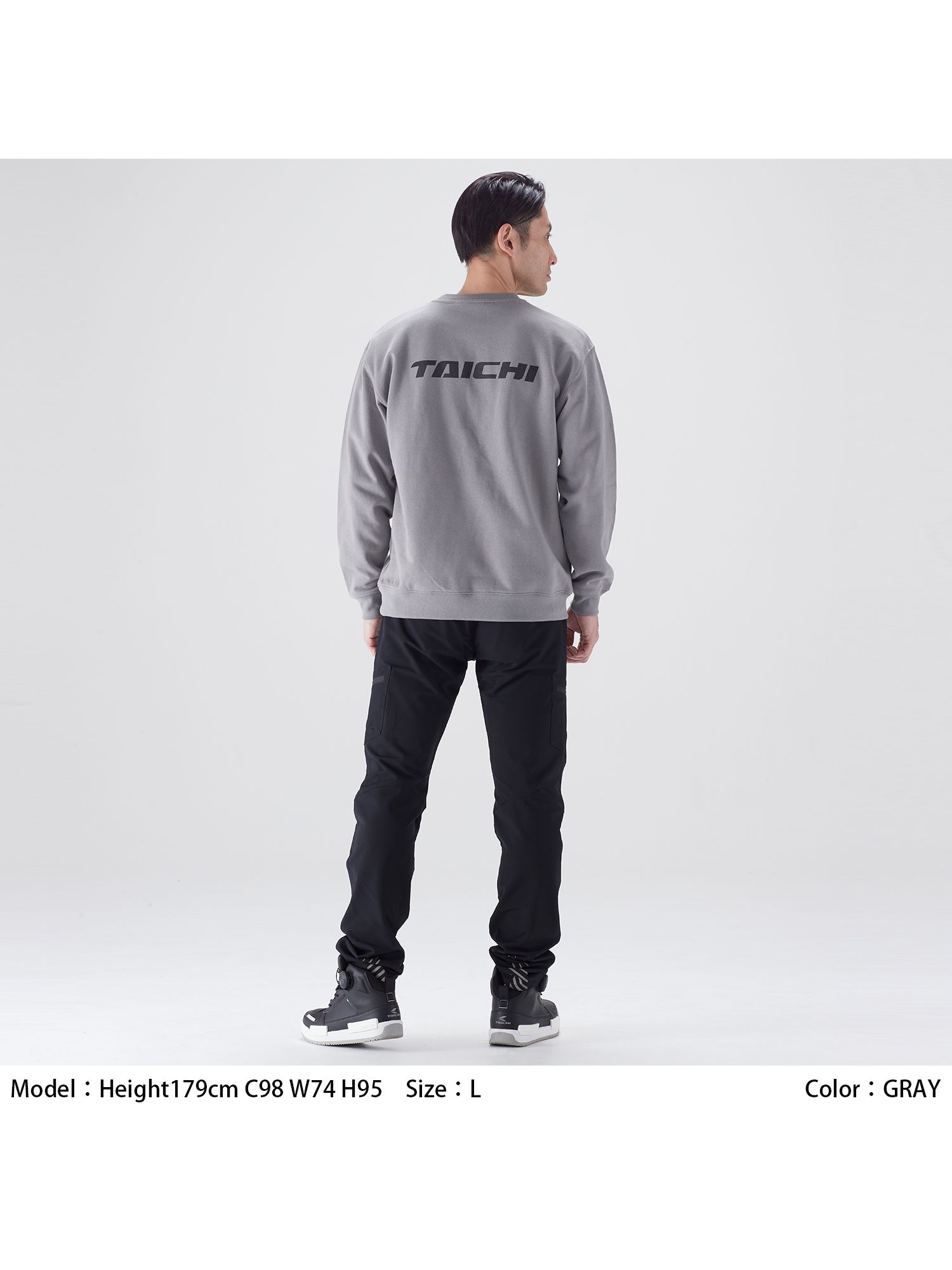 胸元と背面にTAICHIロゴをあしらったクルーネックタイプのスウェット。ライディングでも普段使いにも着まわしやすいベーシックなデザイン。