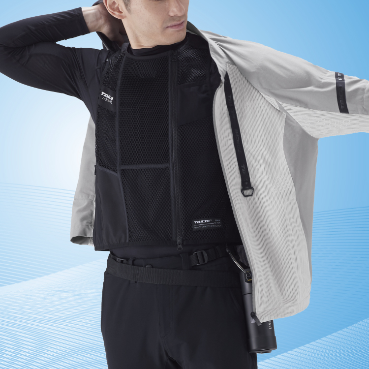冷却水を含んだアンダーシャツに走行風を受けることで急速に冷却。冷却水のメントール成分で冷却効果が長時間持続、夏場のツーリングをひんやり快適にお楽しみいただけます。